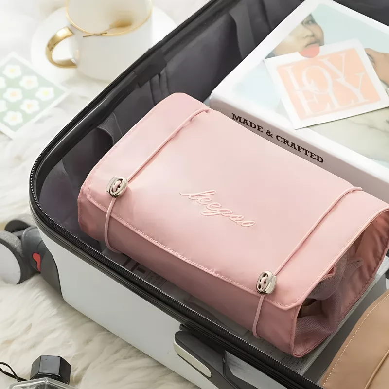 Cette trousse de maquillage pliable peut être fixée sur des portes, des porte-serviettes ou des crochets. Cela rend le contenu facile à voir et à saisir et aide à économiser de l'espace sur le comptoir.